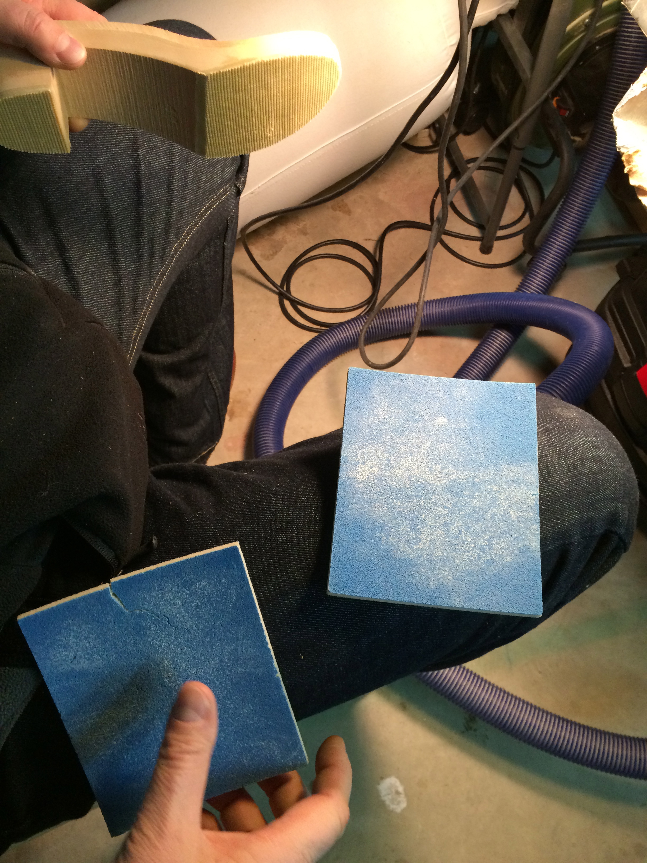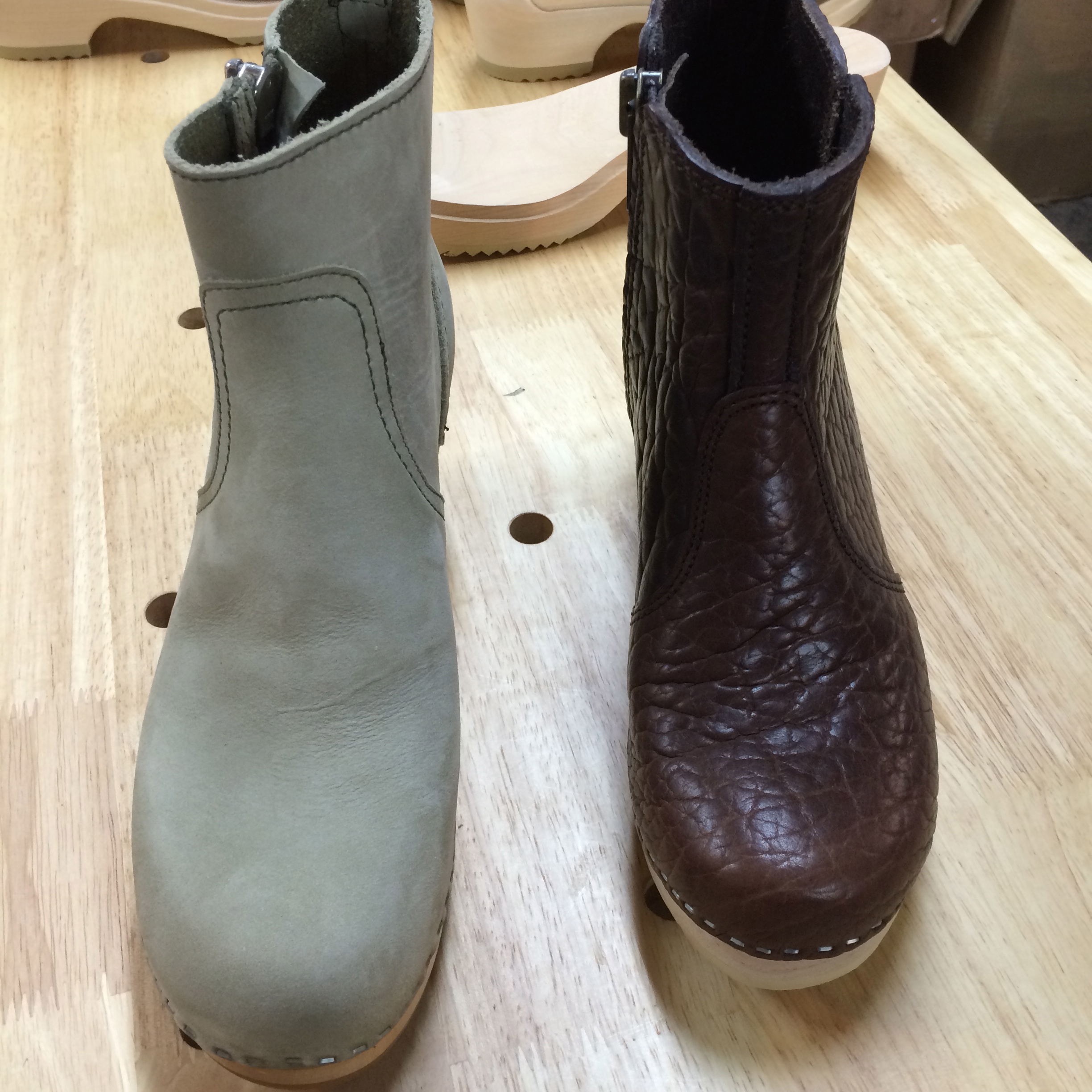 The difference between a sanded, varnished sole (left) and a rough one (right). Most clog manufacturers leave soles unfinished.