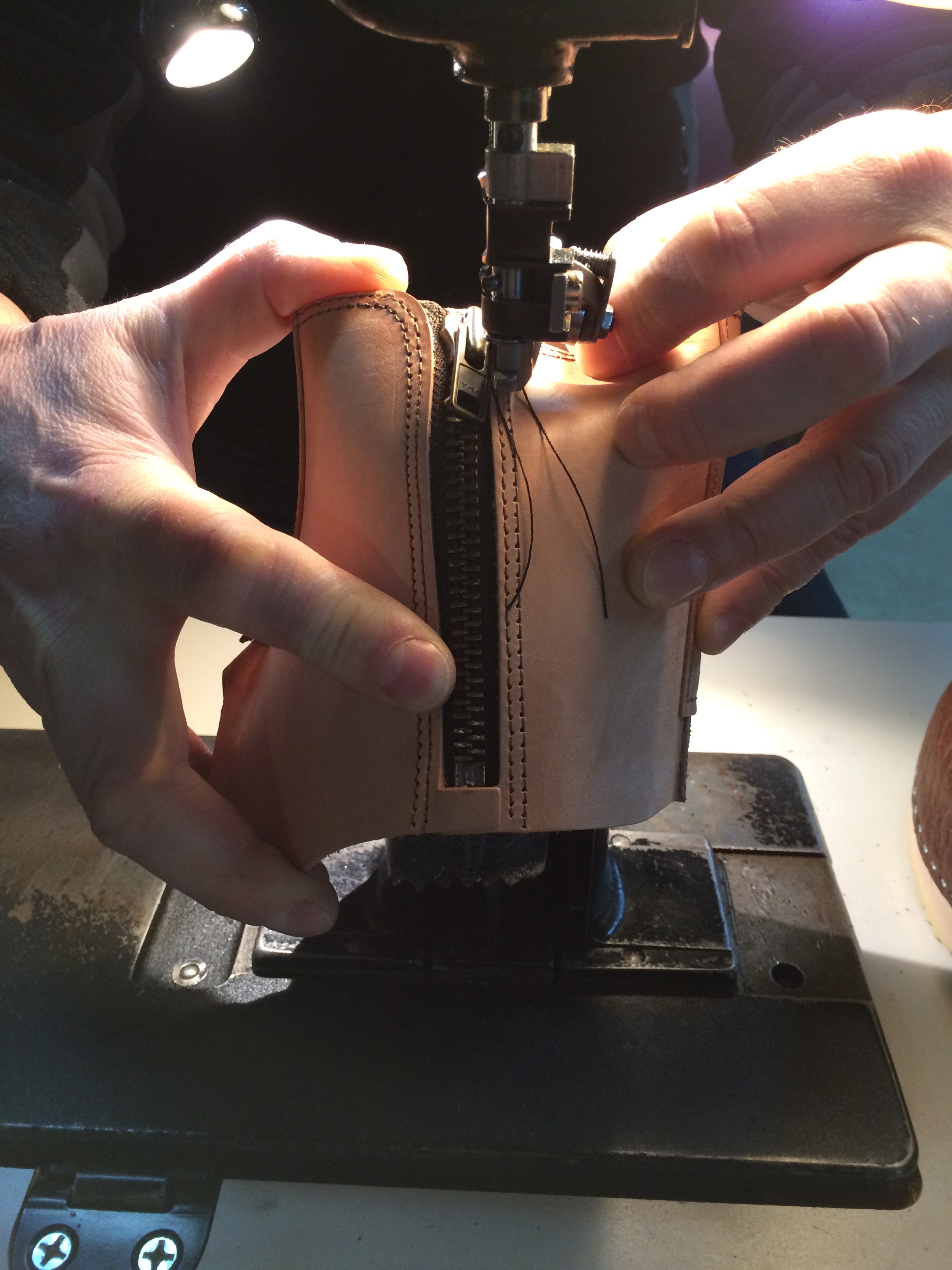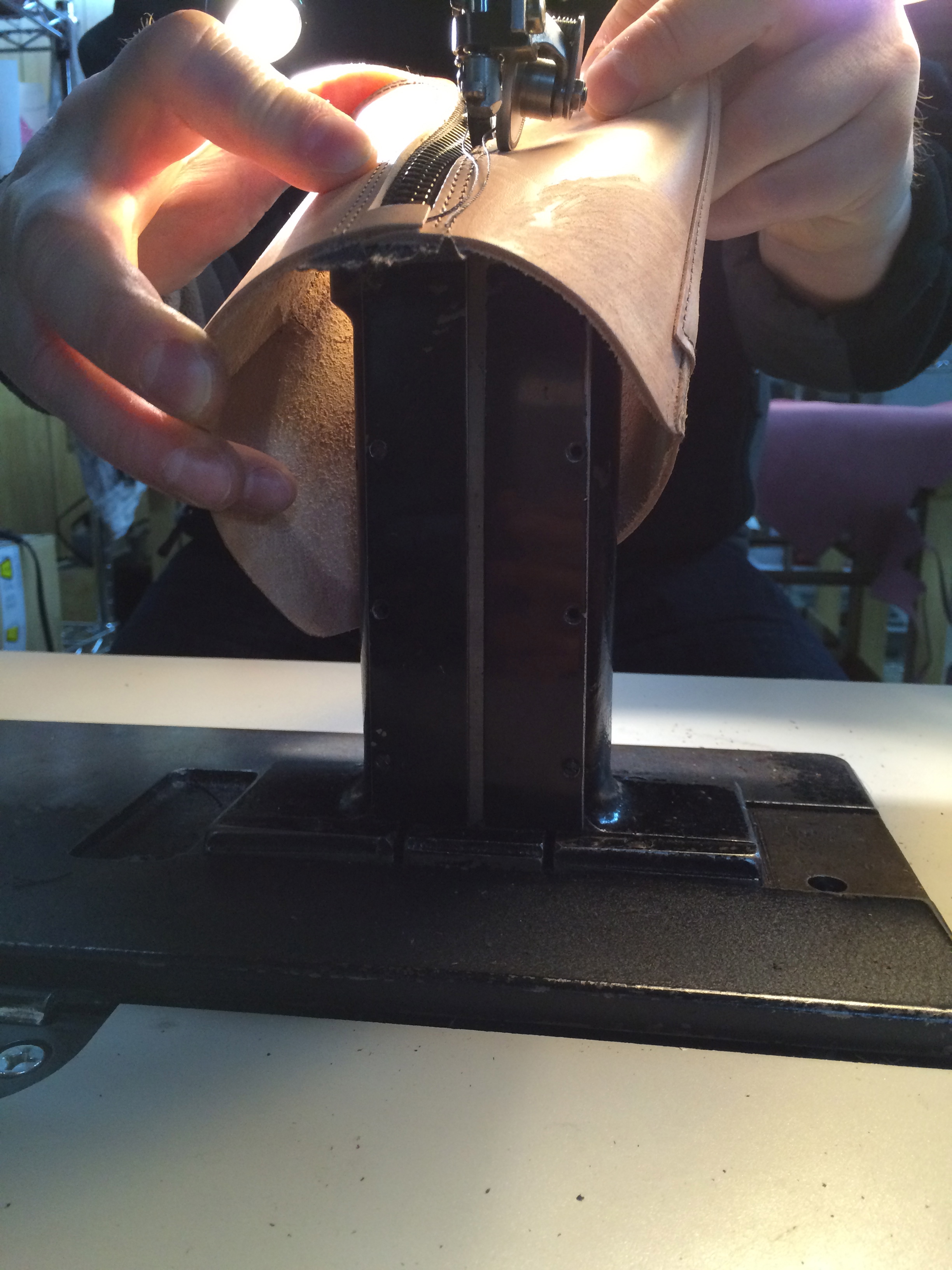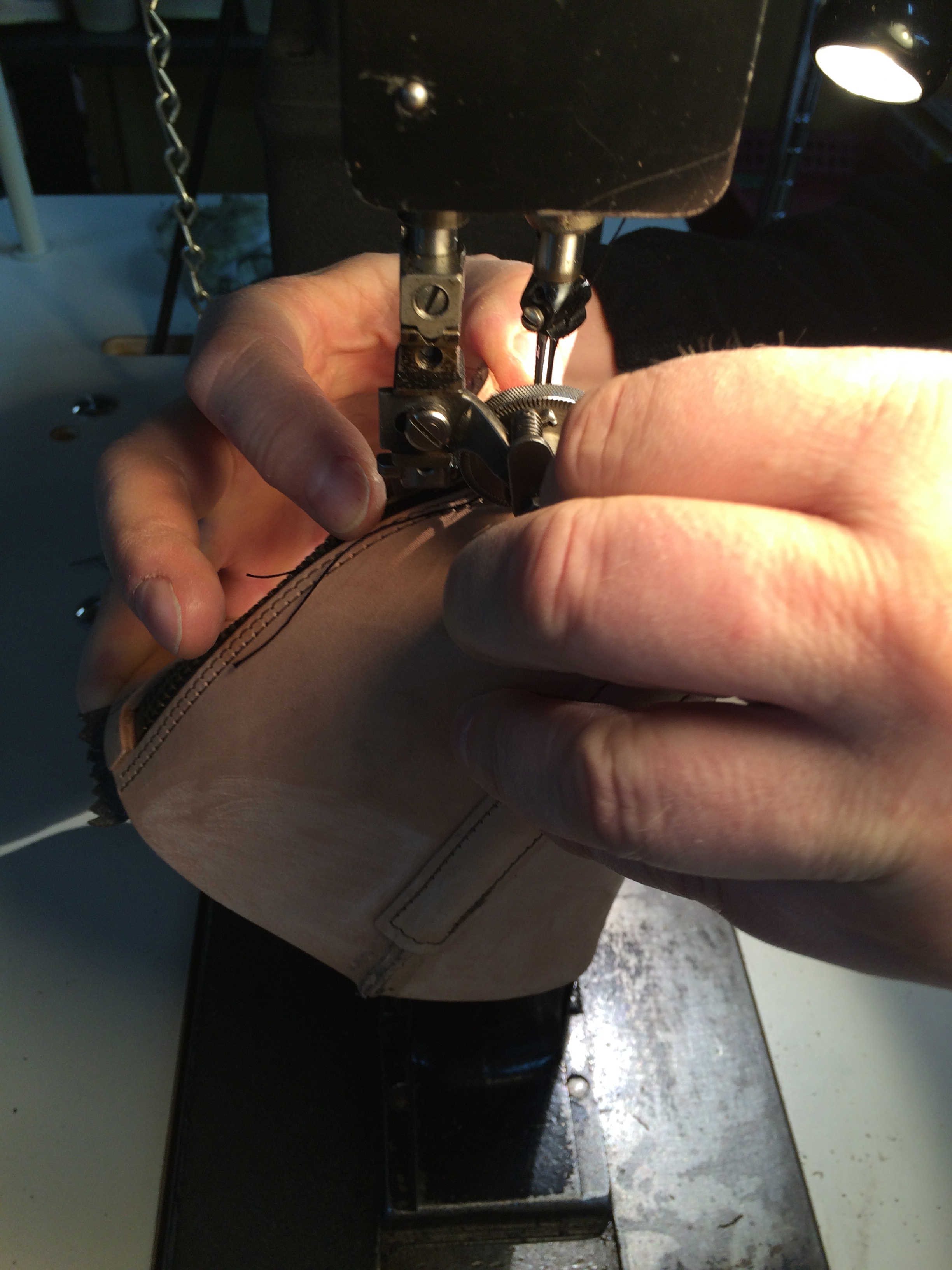 Individual leather pieces are then skived and sewn together using both single and double needle flat bed sewing machines, depending on shoe style.