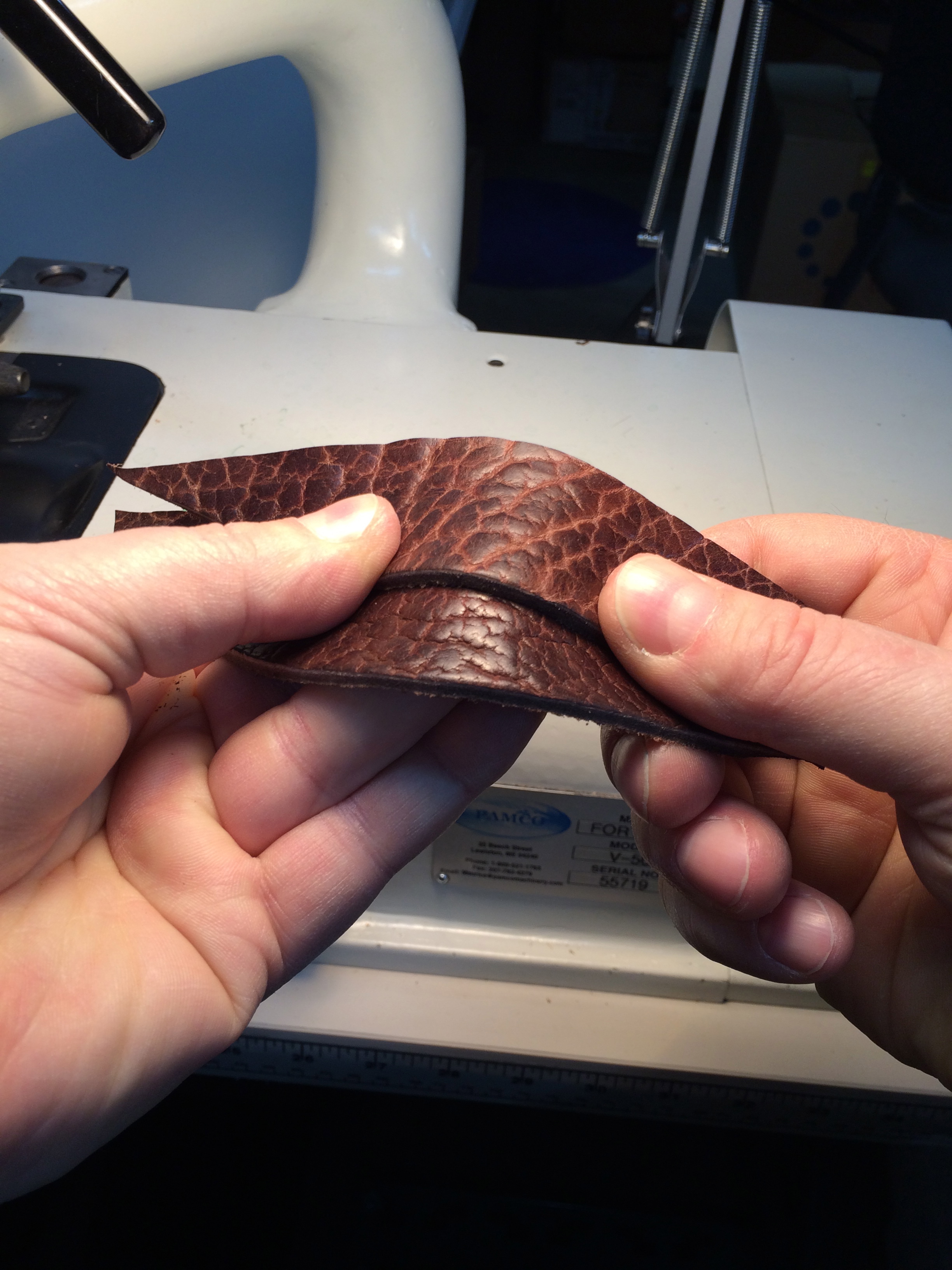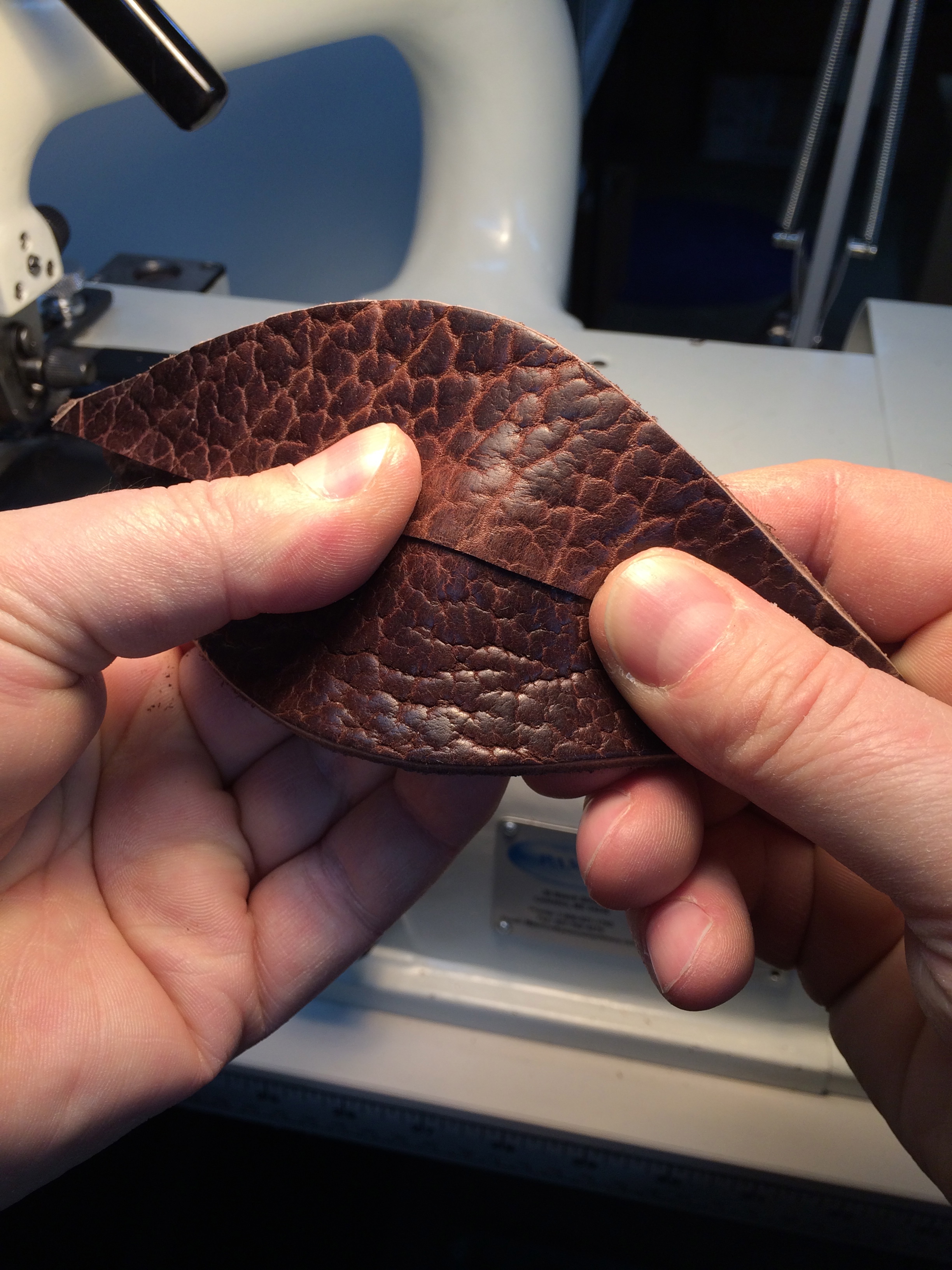 Small piece of scrap leather used as a test run, to ensure proper functioning of machines prior to sewing: